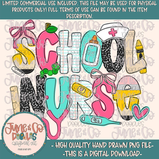School Nurse PNG| School RN Sublimation File| School Nurse Doodle Letters| Medical Occupation Shirt Design| Hand Drawn Art| Digital Download