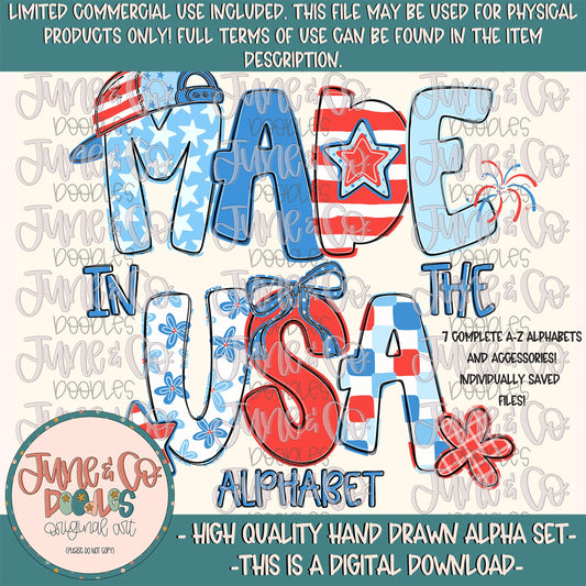 Made In The USA Alphabet Set- PNG| Patriotic Doodle Alpha| Individually Saved Letters| A-Z Doodle Letters PNG| Digital Download