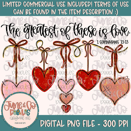 Greatest Of These Hearts PNG| Hanging Hearts Sublimation File| Christian Valentine's Day Shirt Design| Hand Drawn Art| Digital Download