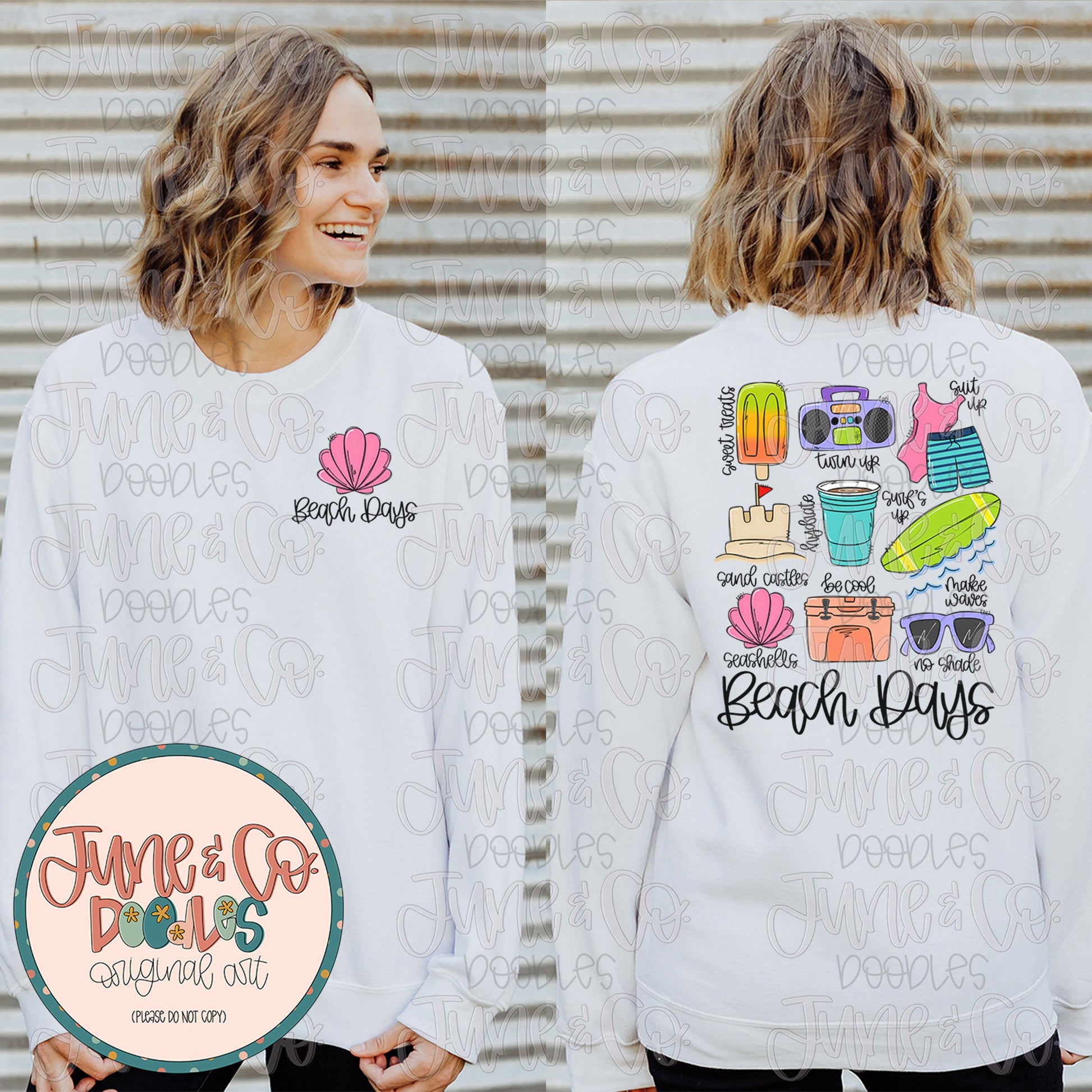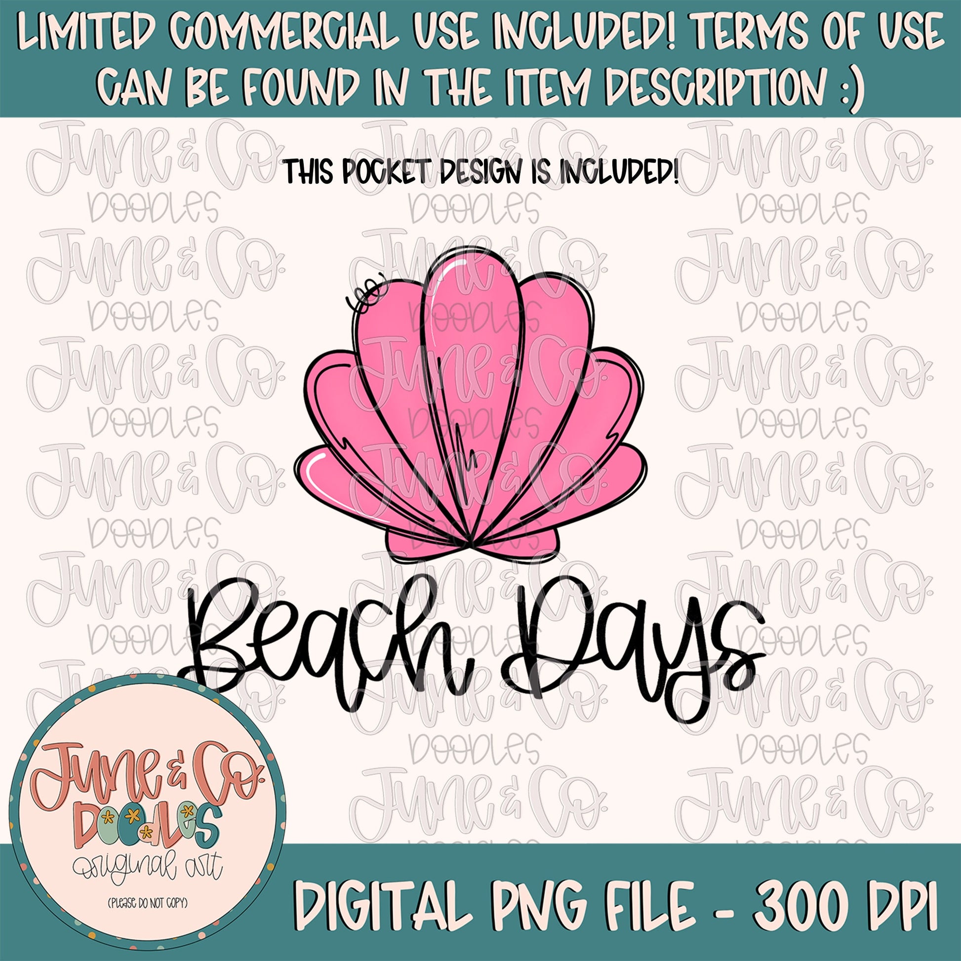 Beach Days PNG features hand lettering and hand sketched "Beach Day" themed doodles, including a popsicle, stereo, swimsuits, sand castle, plastic cup, surf board with waves, seashell, cooler, and sunglasses. Pocket design is included for a front and back option!