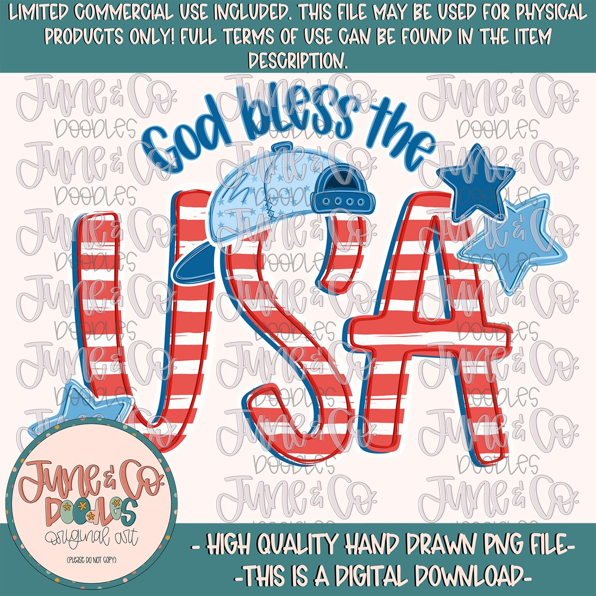 Boys God Bless The USA PNG features hand drawn letters with a backwards hat and stars. Details include sketchy outlines, subtle patterns, and a faded color palette with a vintage vibe. This design is incredibly cute, unique, and on trend! Works great for Memorial Day or Independence Day!