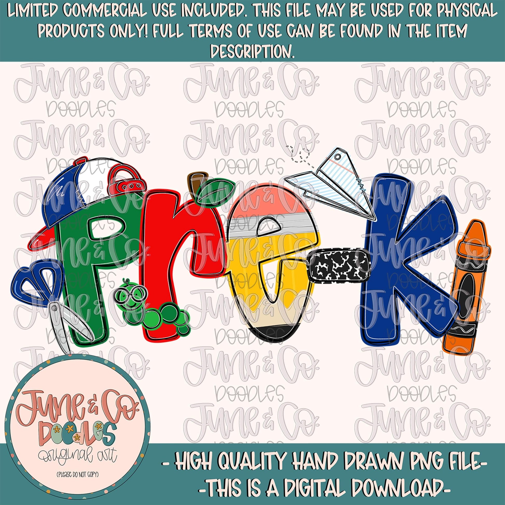 Boys Pre-K PNG features hand drawn doodle letters accented with hand drawn school themed clip art. Perfect for back to school!