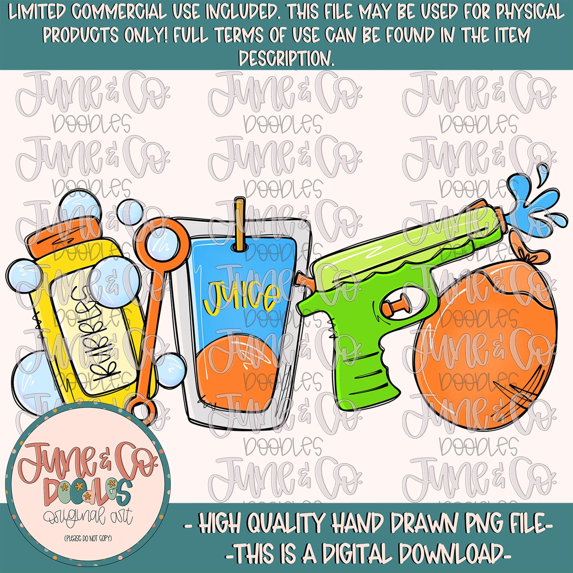 Boys Summer Things Without Name Plate PNG features hand sketched summer fun themed doodles, including bubbles, a juice pouch, water gun, and a water balloon. Personalization is not included, but may be added to your order for an additional fee. If this is something you need, please send me a message!