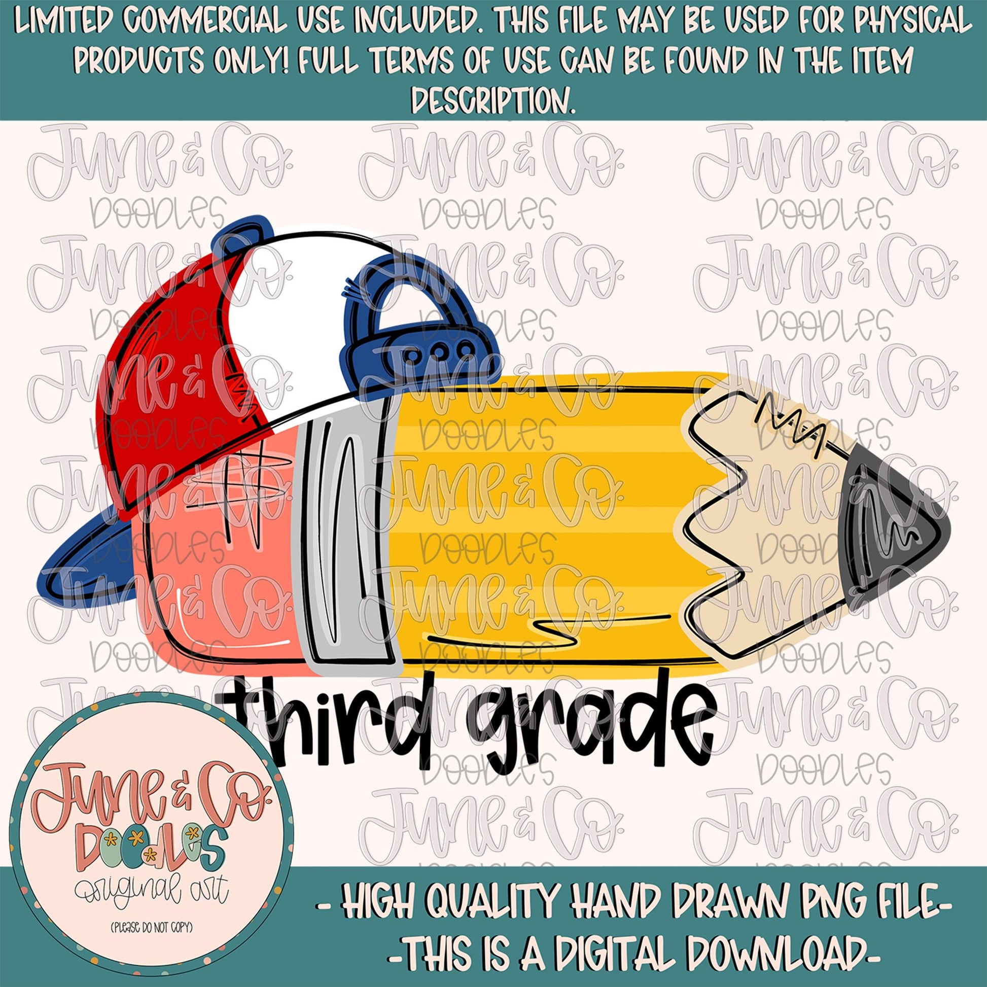 Boys Third Grade Pencil PNG| Pencil With Backwards Hat Sublimation File| Elementary Grade Level Design| Hand Drawn Art| Digital Download