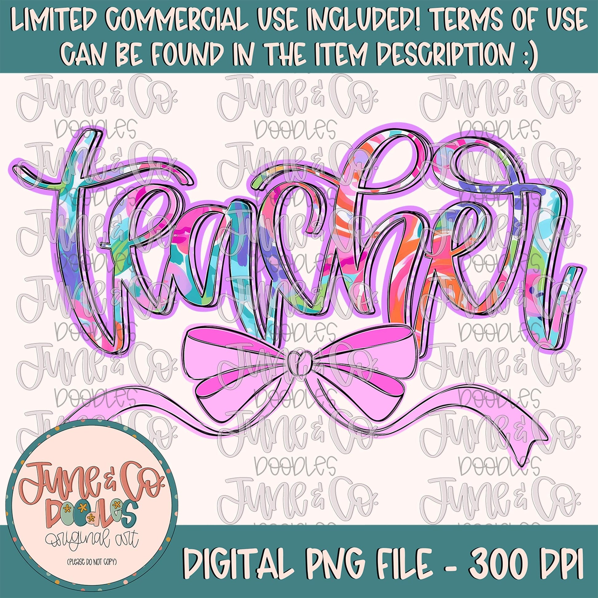 Bright Floral Teacher PNG features hand lettered script filled with a feminine pink floral pattern. Sketchy outlines and a hand drawn bow add depth and sweetness to this design. On trend and perfect for Teacher Appreciation Week or all year long!