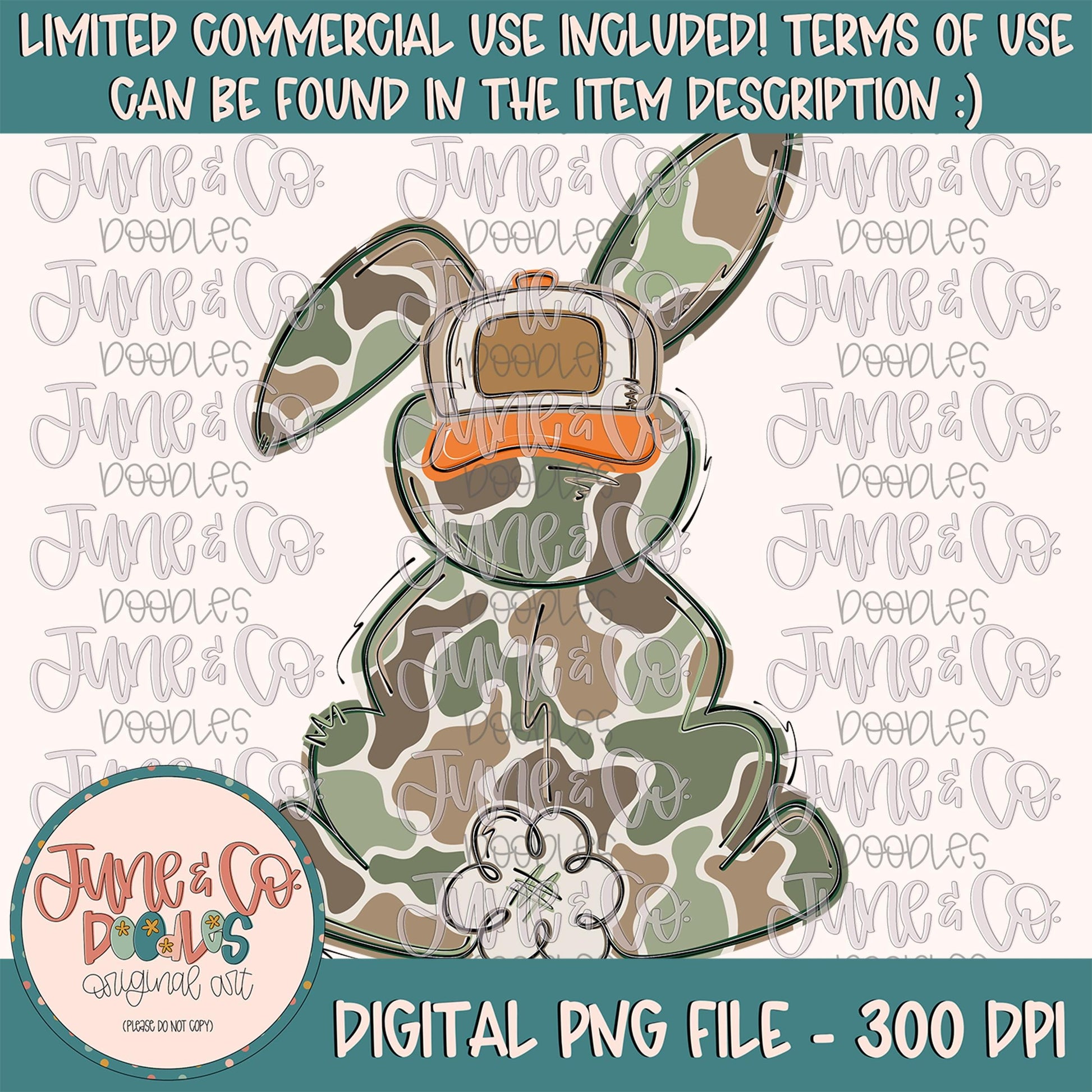 Camo Bunny PNG is a digitally hand drawn bunny silhouette with a backwards ball cap. The camo pattern in shades of green and brown, sketchy outlines, backwards hat with patch give this design a cool, country vibe! This is a variation of my "Egg Hunter" bunny, but with a blank hat patch.