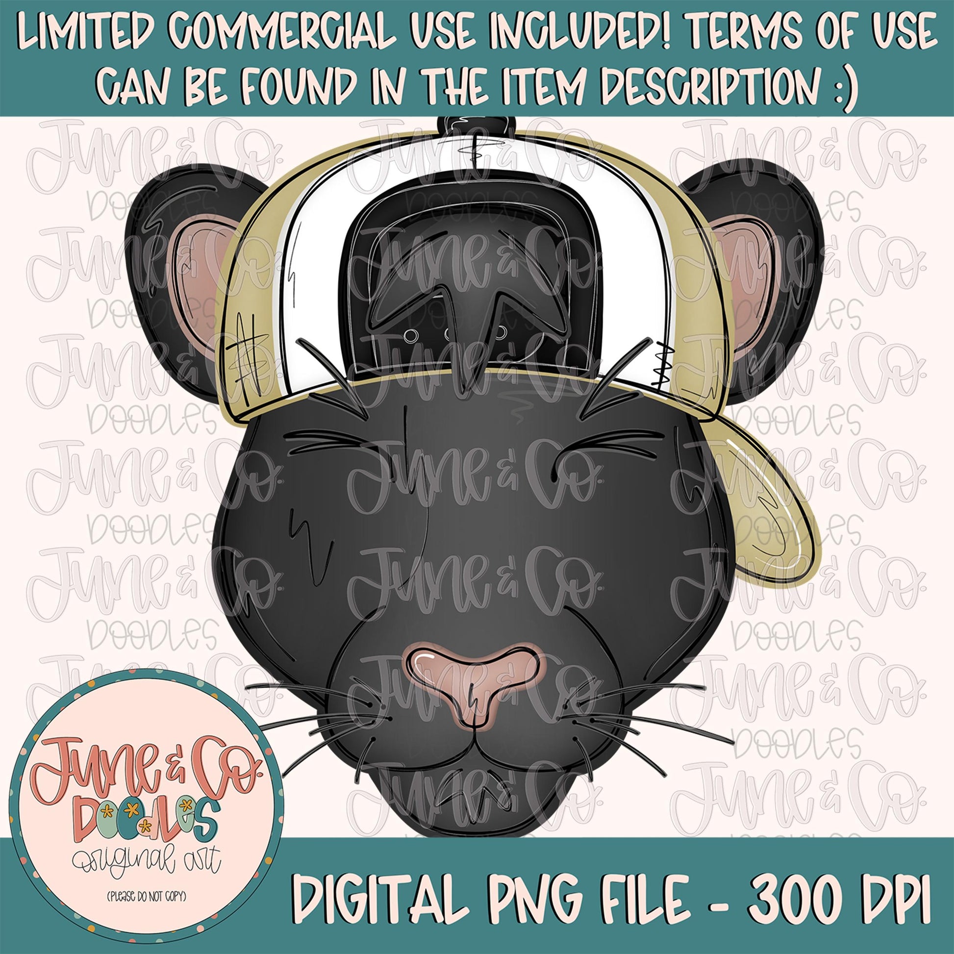 Cool Boy Panther With Hat PNG features a hand sketched panther face with backwards ball cap in black, gold, and white school colors. Perfect for game days!