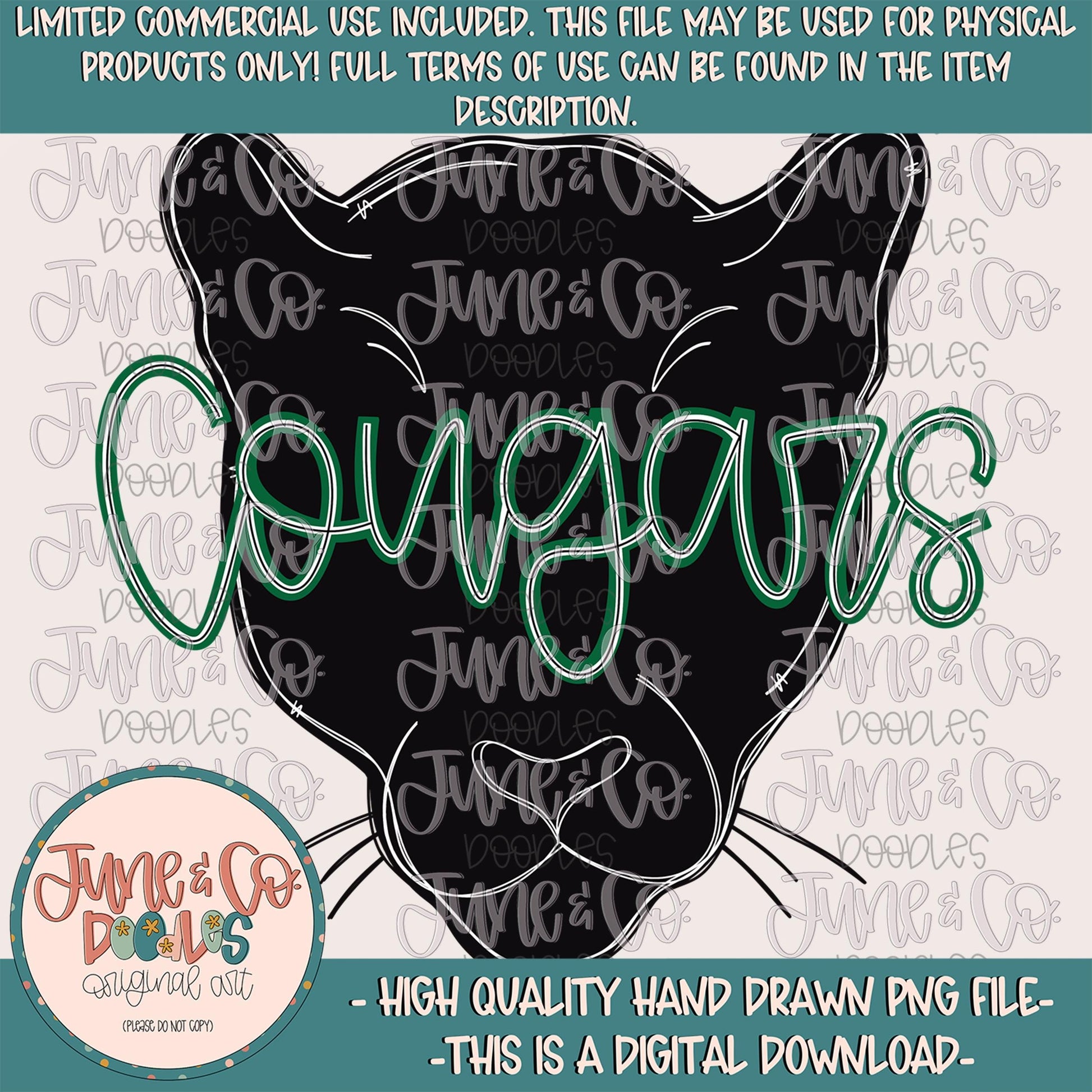Cougars Mascot image file features a sketchy cougar face outline with the mascot name in hand lettered script in green and white school colors. This is the perfect design for game day shirts or for every day wear to show your support for your local team.