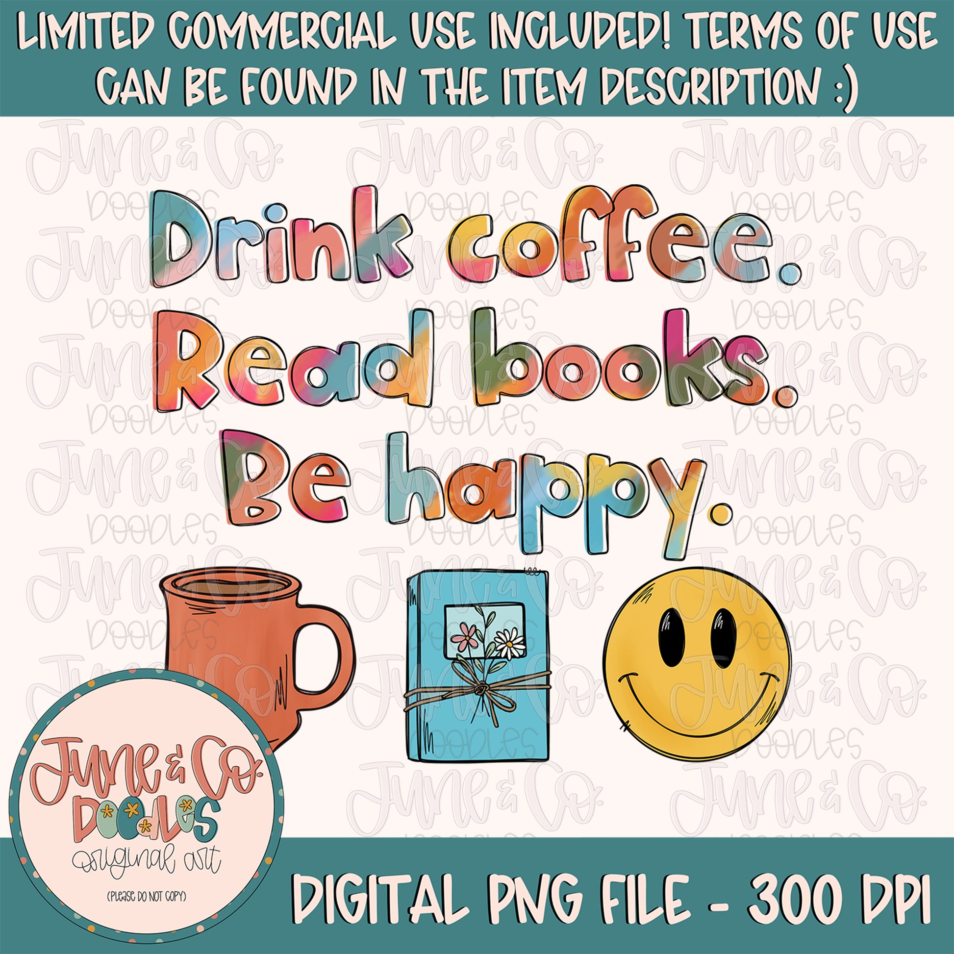 Drink Coffee, Read Books, Be Happy PNG| Books and Coffee Sublimation File| Bookish Shirt Design| Book Lovers Printable Art|Instant Download