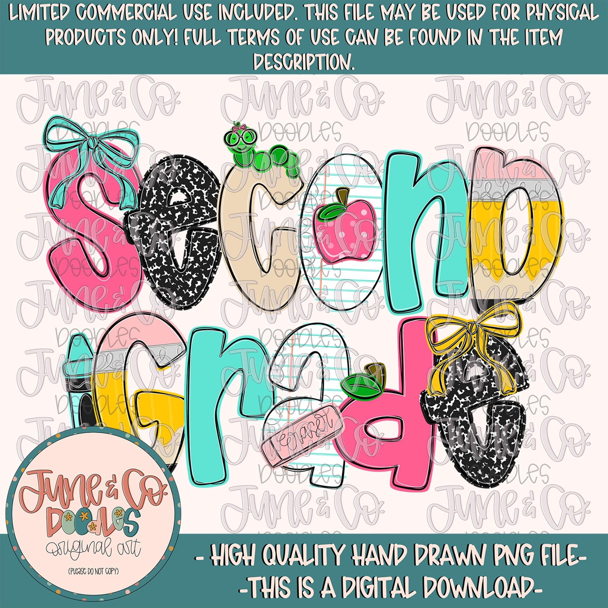 Girls Second Grade PNG features hand drawn doodle letters accented with hand drawn school themed clip art. Perfect for back to school!