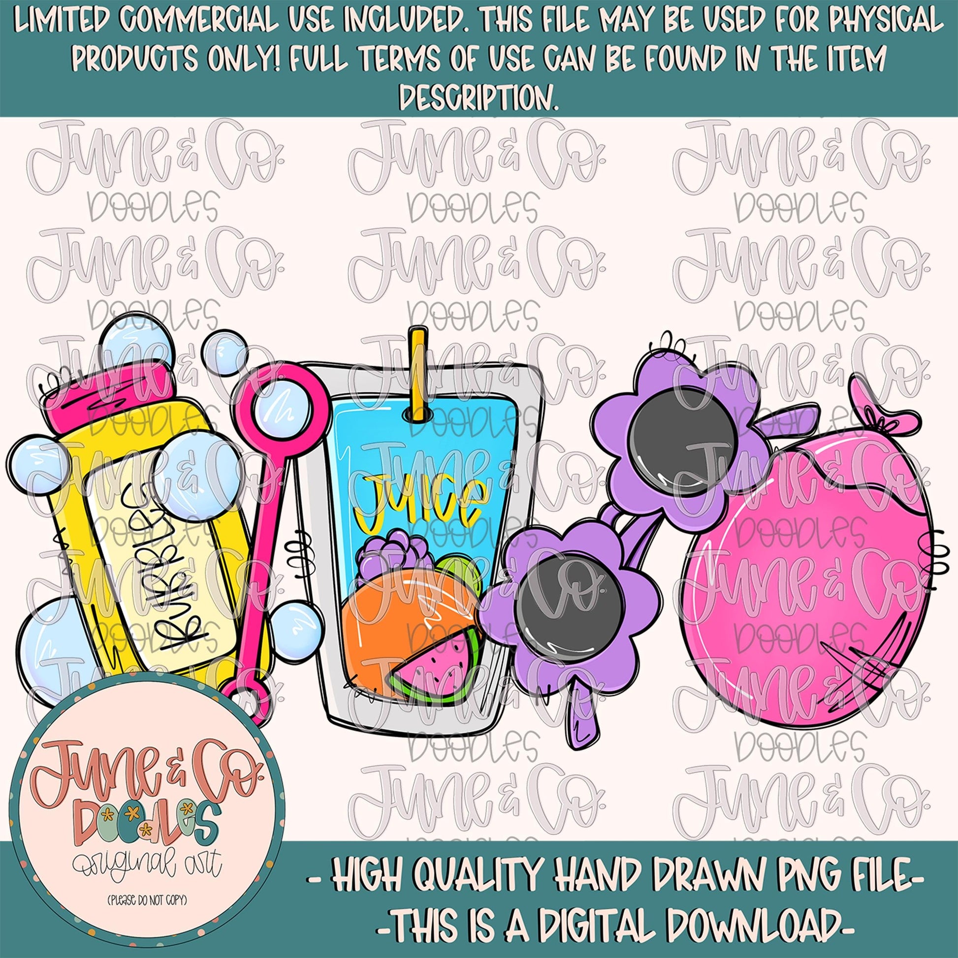 Girls Summer Things Without Name Plate PNG features hand sketched summer fun themed doodles, including bubbles, a juice pouch, funky sunglasses, a water balloon. Personalization is not included, but may be added to your order for an additional fee. If this is something you need, please send me a message!