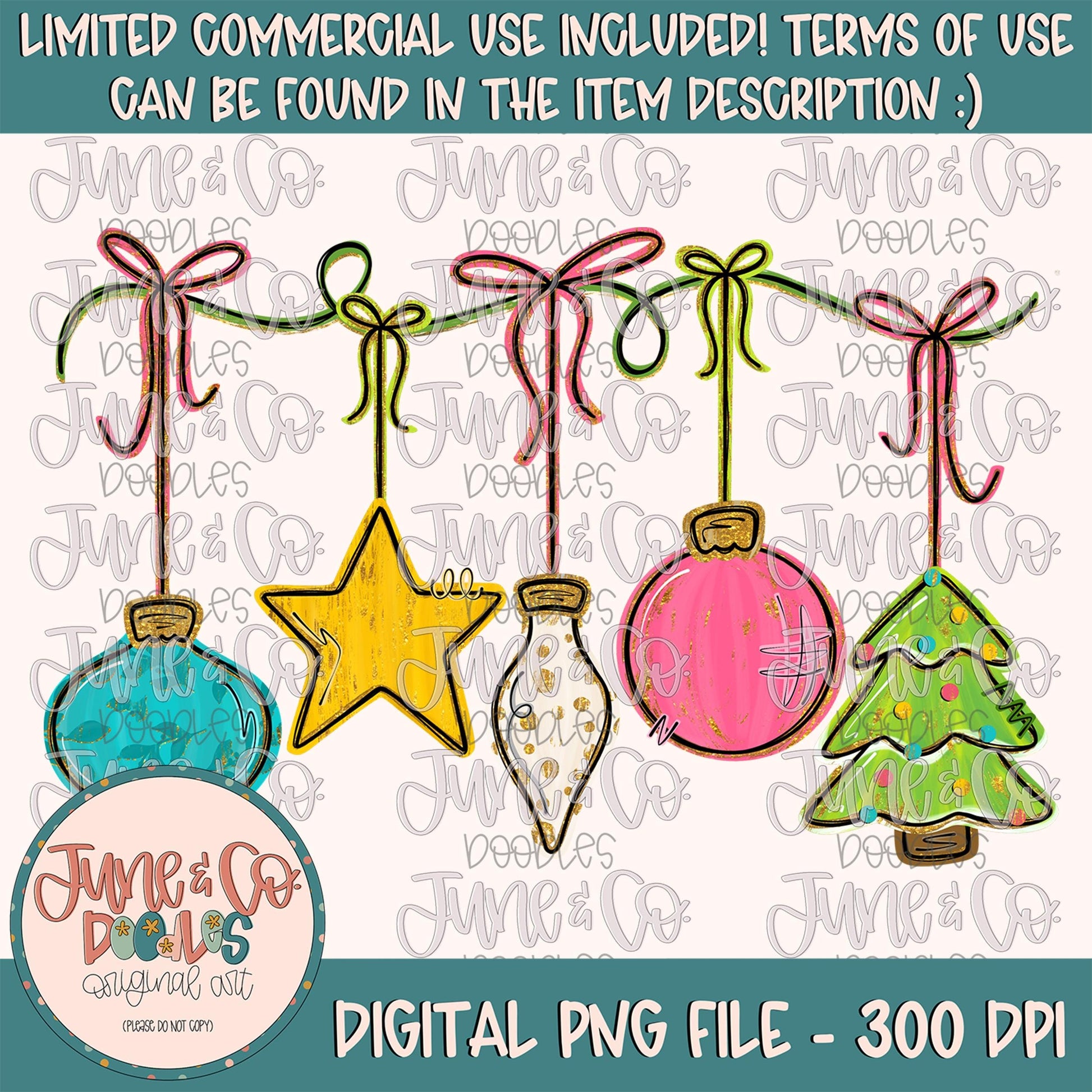 Hanging Ornaments PNG- Bright Colors| Preppy Christmas Sublimation File| Glam Holiday Shirt Design| Hand Drawn Art| Digital Download