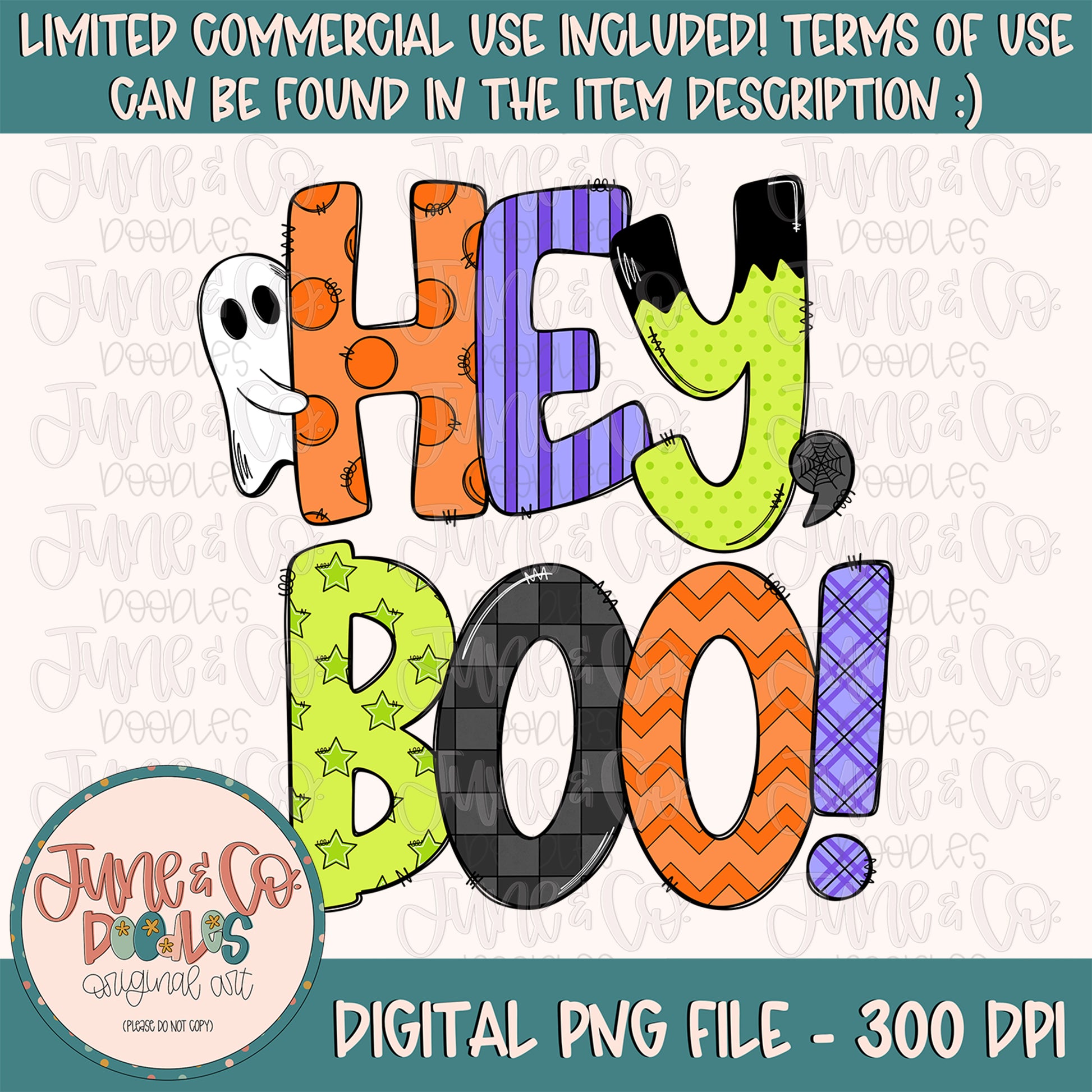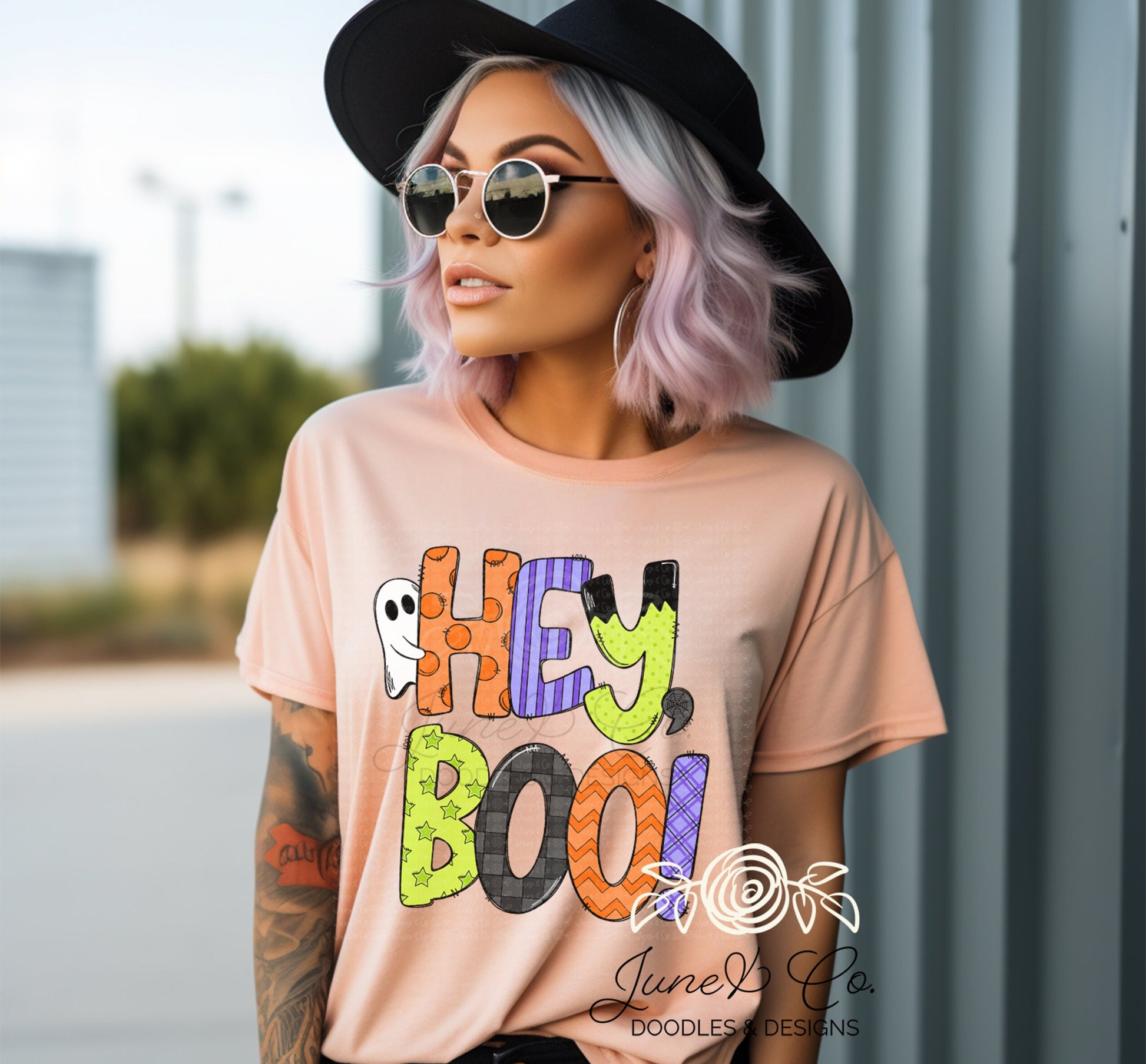 Hey Boo image file features hand sketched doodle letters in bright halloween colors and a hand sketched ghost graphic. This design is perfect for Halloween and works great for great for shirts, home decor, and more!