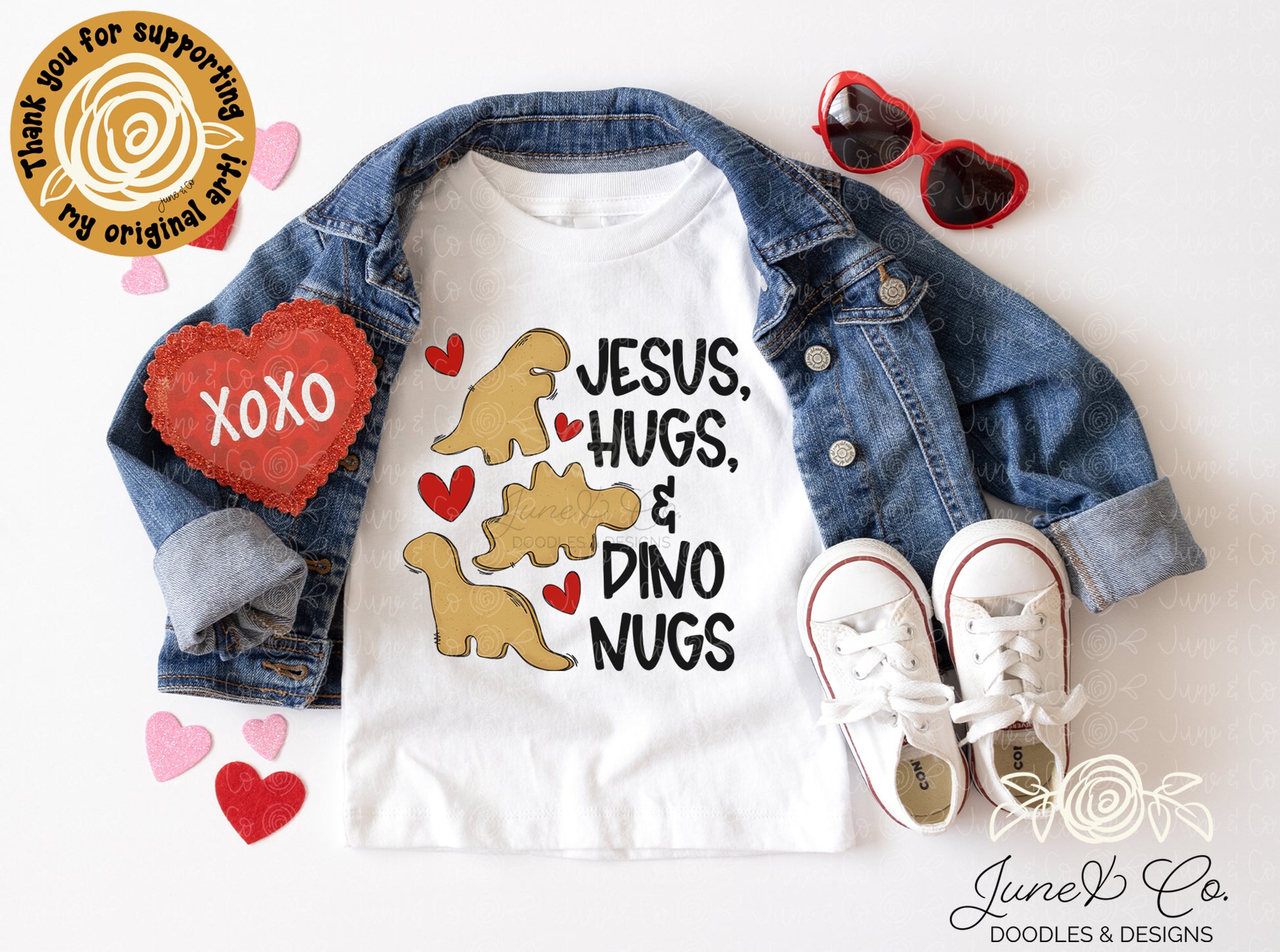 Jesus, Hugs, & Dino Nugs image file features hand sketched dinosaur chicken nuggets and hearts and June & Co. Doodles' hand written 'June' font. This unisex design is perfect for your Dino nugget loving little guy or gal! Great for Valentine's Day or throughout the year!