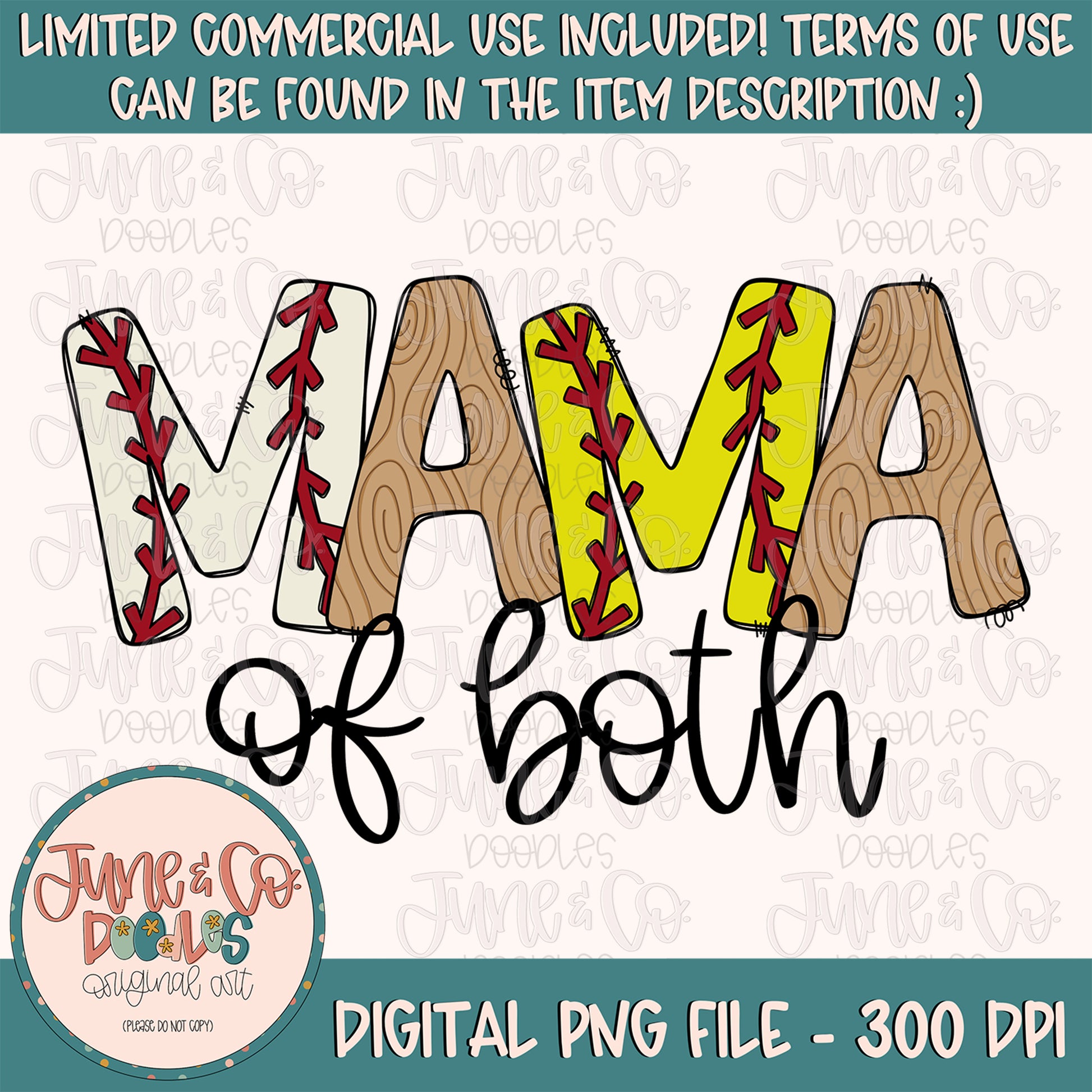 Mama of Both PNG Features hand lettered script and hand sketched doodle letters filled with hand sketched baseball, softball, and wood grain (bat) doodles. Support your favorite athletes in style with this design! Perfect for game days!