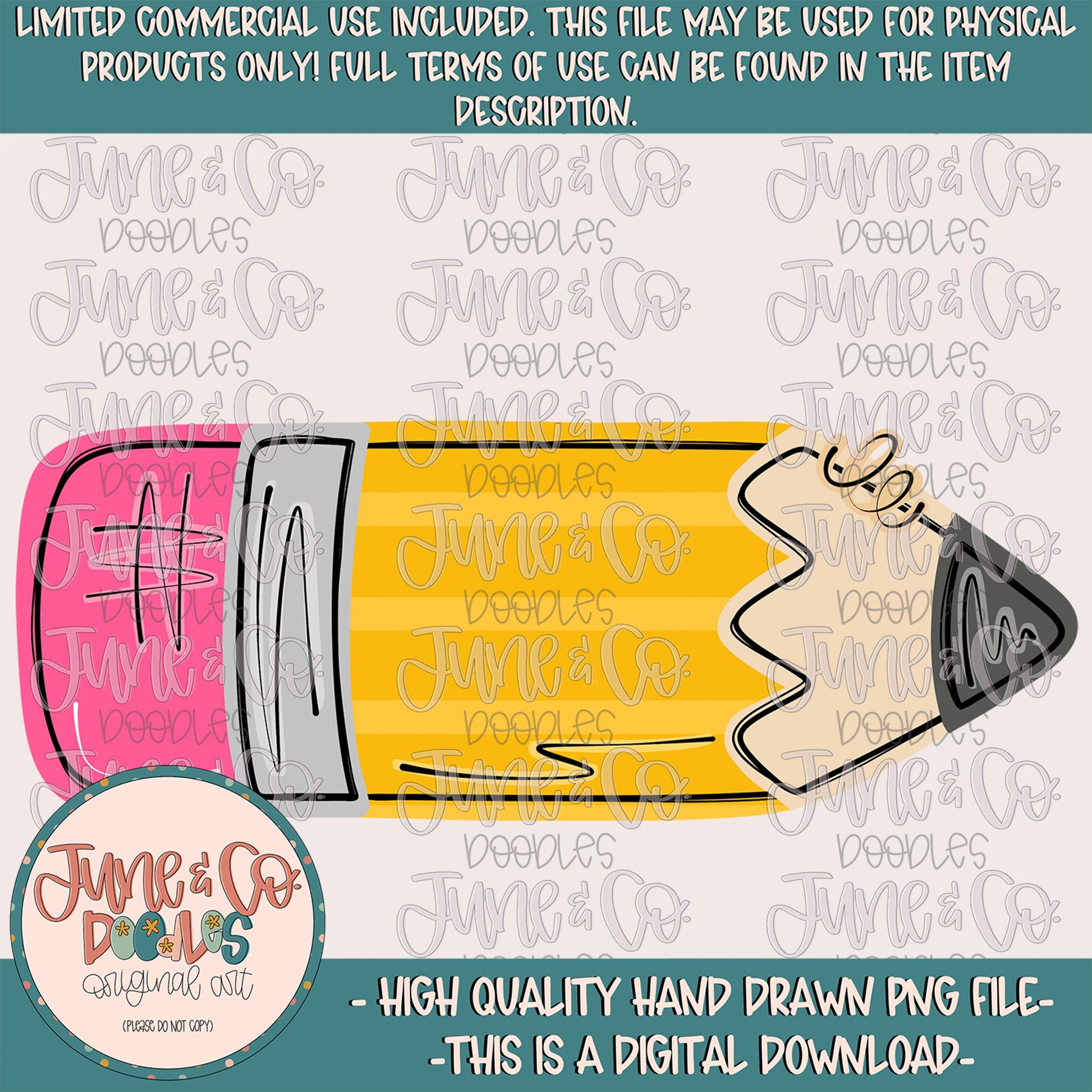 Pencil Doodle PNG features a hand drawn pencil with sketchy details and a bright color scheme. This design is whimsical but simple, which makes it perfect for adding personalization to make it your own!