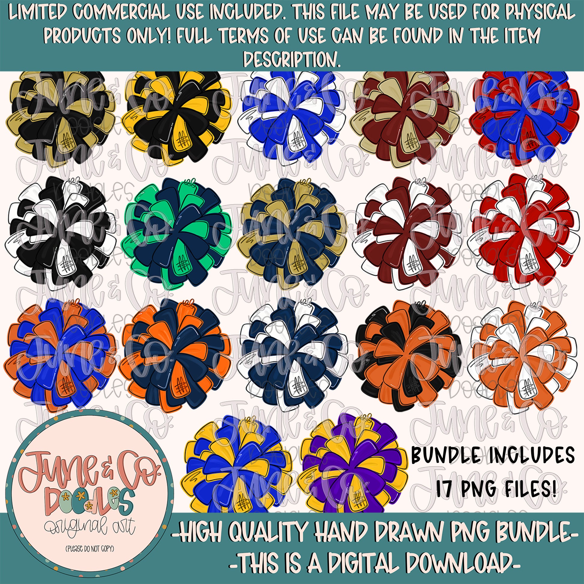 Team Spirit Pom Pom PNG Bundle features 17 individually saved hand sketched pompoms in various team colors. Colors included are shown in the cover photo. This bundle offers a wide variety for a super affordable price, which is perfect for a small business's ability to serve a wide demographic. These pompoms can be used alone or they can be easily personalized to your team for endless possibilities!