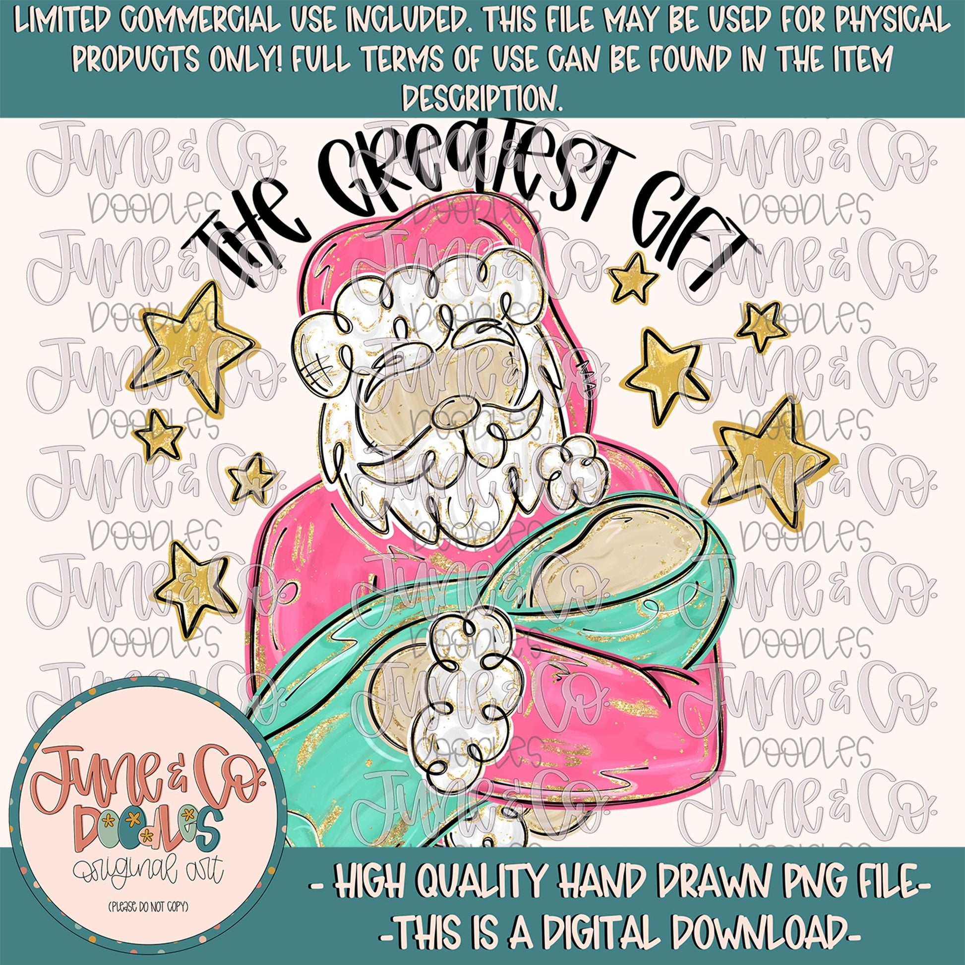 The Greatest Gift PNG- Glam Pink| Brush Stroke Santa Sublimation File| Faith Christmas Holiday Design| Hand Drawn Art| Digital Download