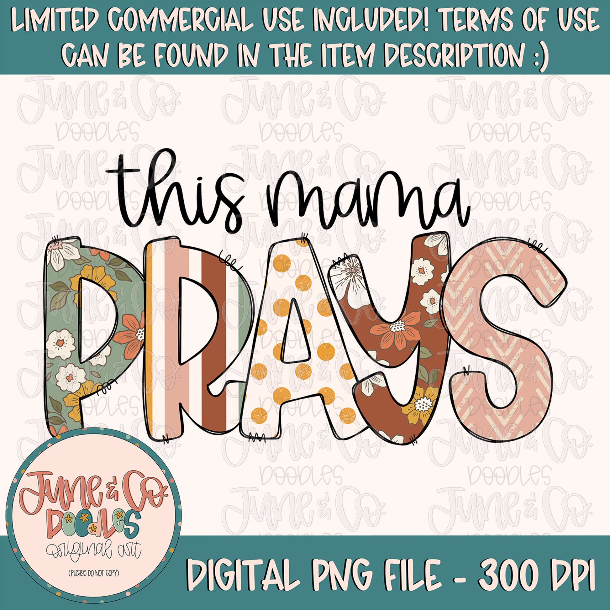 This Mama Prays image file features hand lettered script and hand sketched doodle letters filled with fun patterns in a boho color scheme. Great for shirts, cups, sticker, and many other crafting projects!
